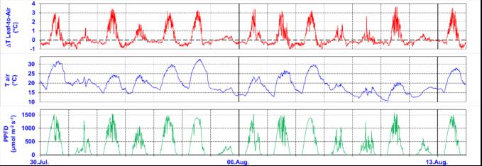 图1:叶片表面和周围空气(t)的温差比较,空气温度,(TAIR)和太阳辐射(PPFD)。