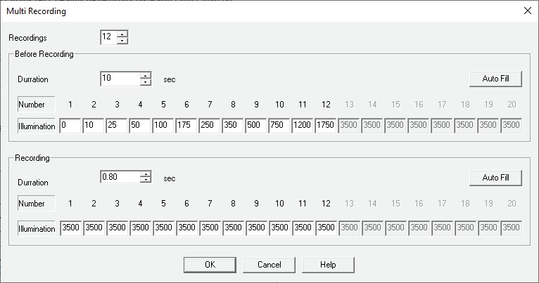 9 进入“Multi Recording”窗口,在“Before Recording”区域的“illumination”定义RLCs的光化光梯度光强。