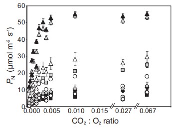 随着CO2:O2比率的增加,所有物种的PN速率都增加。然而,当CO2:O2比率达到约0.005时,在所有的测试物种中PN均达到平台期(图3)。