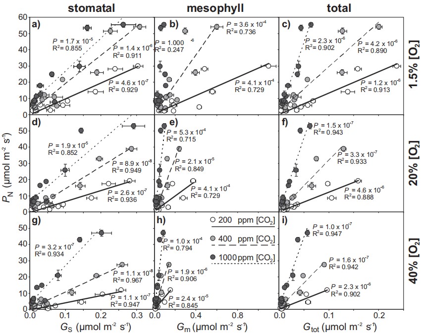 图8在200、400和1000 ppm CO2和1.5%(a至c)、20%(d至f)和40%(g至i)O2时,PN与气孔(Gs)、varJ叶肉(Gm)和总(Gtot)对CO2的传导率之间的关系。
