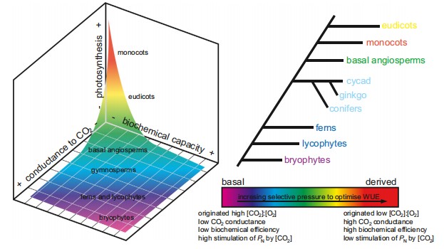 大气中CO2和O2的浓度([CO2]和[O2])通过核酮糖-1,5-二磷酸羧化酶/加氧酶(RubisCO)直接影响植物光合速率(PN)和光呼吸速率(RPR)。[CO2]和[O2]随着地球历史的变化而变化,影响着植物对CO2的吸收和释放,以及蒸腾。由于RubisCO对CO2具有更强的特异性,CO2的可用性可能比O2起到更强的选择压力。[O2]的作用以及[O2]和[CO2]之间的相互作用在植物进化史中的作用尚不清楚。