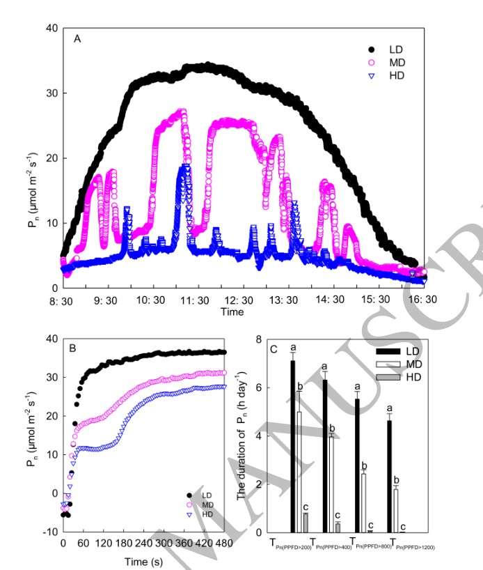 不同种植密度下玉米穗位叶光合速率的日变化过程如图2所示。光合速率在早晨较低,然后逐渐增加,中午达到峰值,此后逐渐下降(图2A)。光合速率随着种植密度的增加而下降,特别是在中午。与穗位叶光强日变化趋势相似,在MD和HD处理下,光合速率的日变化过程也表现出明显的波动(图2A)。当光强高于200、400、800和1200μmol m-2s-1时,相应的光合作用持续时间随着植物密度的增加而减少(图2C)。当光强超过1200μmol m-2s-1时,与LD相比,MD和HD处理的光合作用持续时间分别下降了60%和90%以上。这些发现表明,增密会缩短一定水平以上光强下光合作用的持续时间。本研究还测定了在不同种植密度下生长的玉米穗位叶的光合诱导曲线。在这个过程中,光合速率在初级阶段迅速增加,之后缓慢上升到最大值。在LD、MD和HD条件下,最大光合作用分别在约180s、270s和330s内被诱导(图2B),这表明种植密度的增加降低了光合诱导的速率。