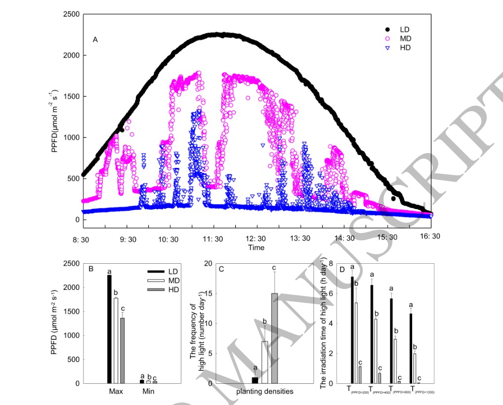 如图1所示,为了探明晴天光照强度的日变化对穗位叶的影响,研究人员在田间设置了三个玉米种植密度??梢钥闯觯绯抗馇慷冉系?,中午逐渐达到最大,之后逐渐降低。随着种植密度的增加,最大光照强度降低。特别是最大和最小光强之间的差异在中午前后变得更加明显(图1B)。此外,光波动的频率随着种植密度的增加而增加(图1C)。进一步分析发现,当光强高于200、400、800和1200μmol m-2s-1时,强光持续时间随着种植密度的增加而减少(图1D)。与LD相比,MD和HD处超过1200μmol m-2s-1的强光持续时间在一个昼夜周期内分别减少了58%和90%。可以看出,种植密度的增加缩短了强光的持续时间。