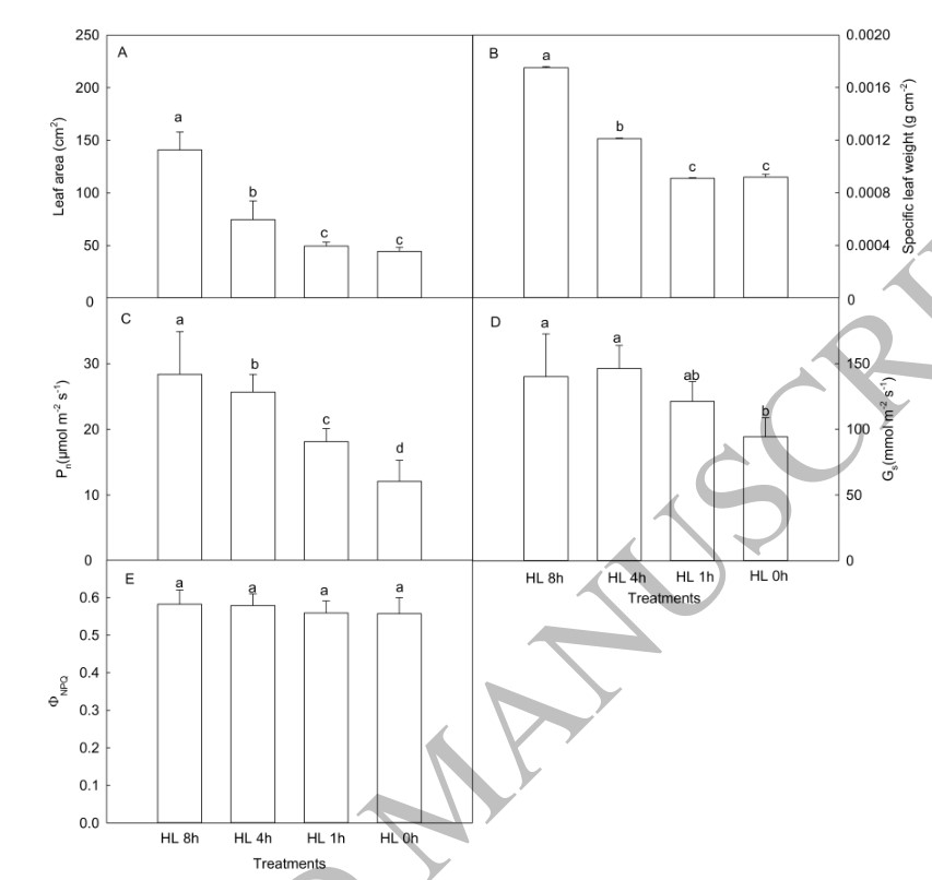 研究人员模拟了波动频率对光合作用的影响。结果表明,随着光照波动频率的增加,叶面积和SLW变化不显著,而净光合速率和气孔导度逐渐降低(图4A,B,C,D)。与FL 1/300 min相比,FL 1/30min和FL 1/3min的光合速率分别降低了约8%和18%。与FL 1/300 min相比,FL 1/330 min和FL 1/3 min的调节能量耗散量子产率(ΦNPQ)分别增加了3%和8%(图4E)。