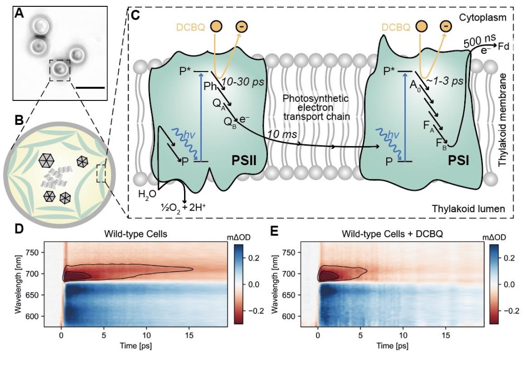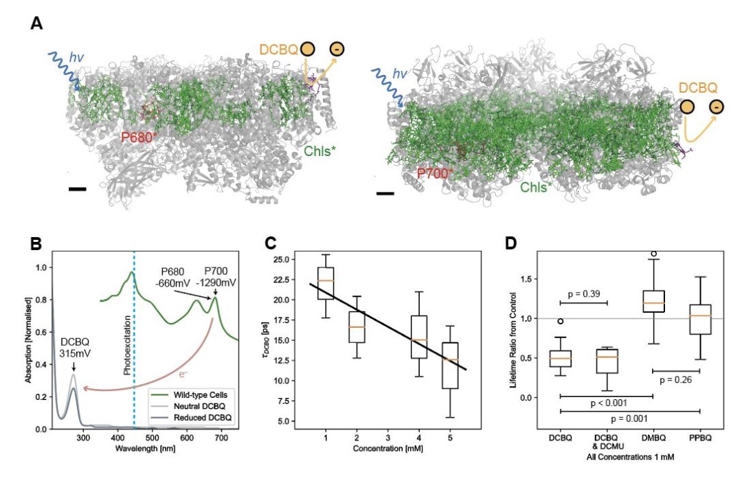 图 2. DCBQ对野生型蓝藻细胞氧气释放的影响研究人员推测,这些媒介物在最初的光激发后,会氧化外围的叶绿素色素,并参与高度脱域的电荷转移状态。这些研究结果对以前的模型提出了挑战,即光激发的反应中心在光系统蛋白支架内是绝缘的,也为研究和重连光合作用的生物技术和半人工光合作用开辟了新途径。