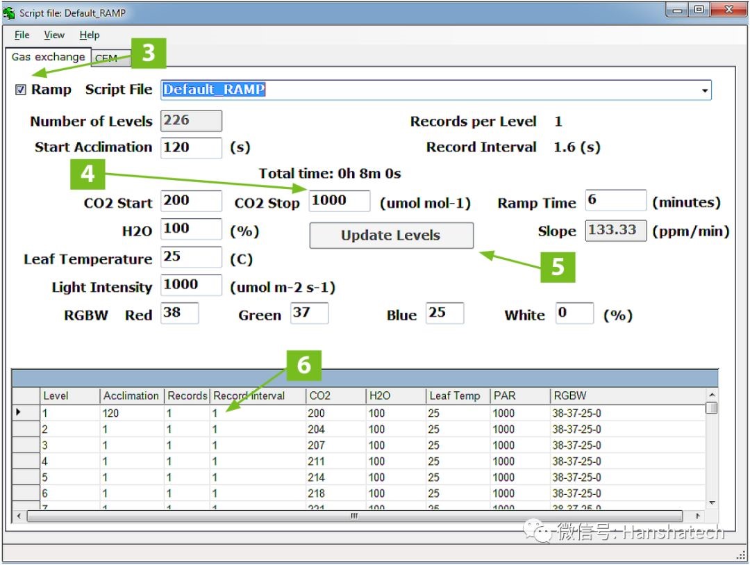 4)编辑起始CO2浓度(CO2 Start)、终止CO2浓度(CO2 Stop)、响应曲线时间(Ramp Time),以及其它试验参数;