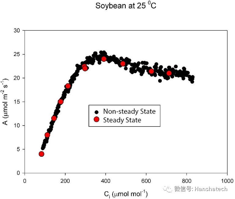 · 红点:传统点-点稳态A/Ci测定方法,每点稳定约2min