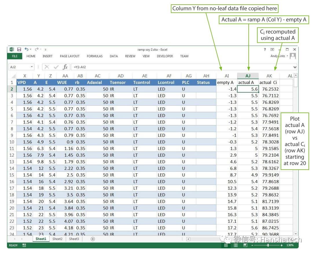 4)如图计算实际净光合速率:即图中Actual A = ramp A (Col Y)- empty A;