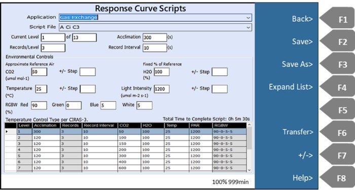 响应曲线(常规A/Ci响应曲线、光响应曲线、快速A/Ci响应曲线)均可以在电脑端用软件进行自定义程序编辑设置,随后使用U盘将设置好的程序导入仪器内部即可,以下为通过相应软件