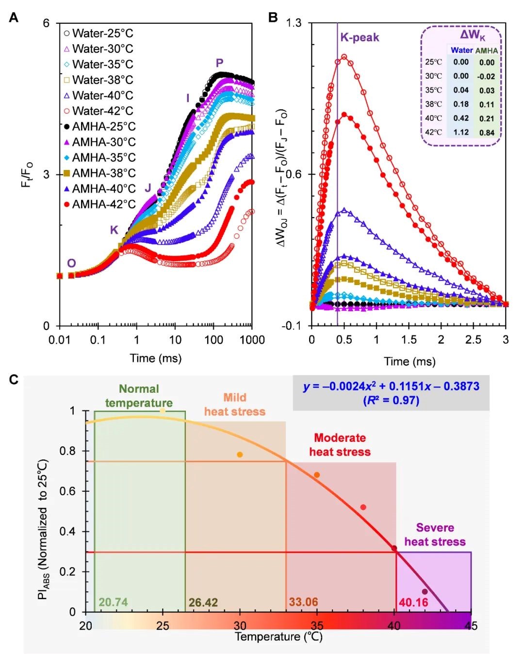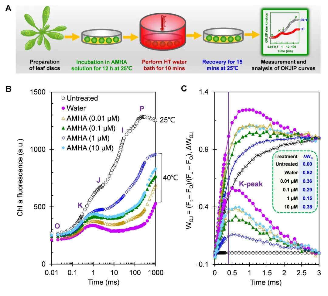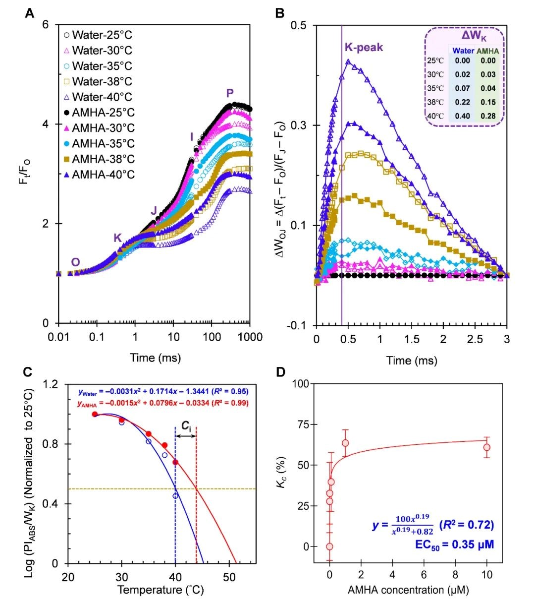 2 AMHA可缓解高温条件下拟南芥叶片OJIP曲线随温度而发生的变化 先前的研究表明,仅在中度和重度HT胁迫下,OJIP曲线才会出现明显的K-step。本文中作者探讨了6个温度梯度下AMHA对拟南芥叶片OJIP曲线影响。 在对照和1μM AMHA处理的叶片中,OJIP曲线的K-P相水平随温度升高而下降(图2A)。在除25℃外的不同HT胁迫水平下,AMHA处理的叶片的K-P相均高于对照样品(图2A)。与25℃相比,暴露在30℃以上温度下的叶片,无论是否存在AMHA或水,ΔWOJ都会随温度的升高而增加(图2B)。此外,在相同的HT条件下,与对照相比,AMHA处理使k峰分别下降了25%(35℃)、39%(38℃)、50%(40℃)和25%(42℃)(图2B)。在40℃高温胁迫下,AMHA完全消除了高温诱发的K-step,并明显抬高了OJIP曲线。然而,在42℃HT胁迫下,AMHA并不能明显缓解K-step出现(图2A,2B)。这说明42℃的危害太大,使得AMHA无法防止叶片中OEC的热损伤。因此,40℃是拟南芥叶圆片离体实验系统中评估AMHA诱导抗高温胁迫活性的一个更合适的高温胁迫条件。