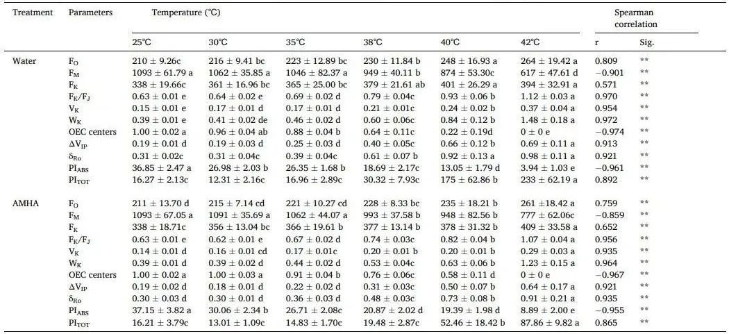表1 1μM AMHA对不同高温下拟南芥叶片热响应JIP-test参数的影响