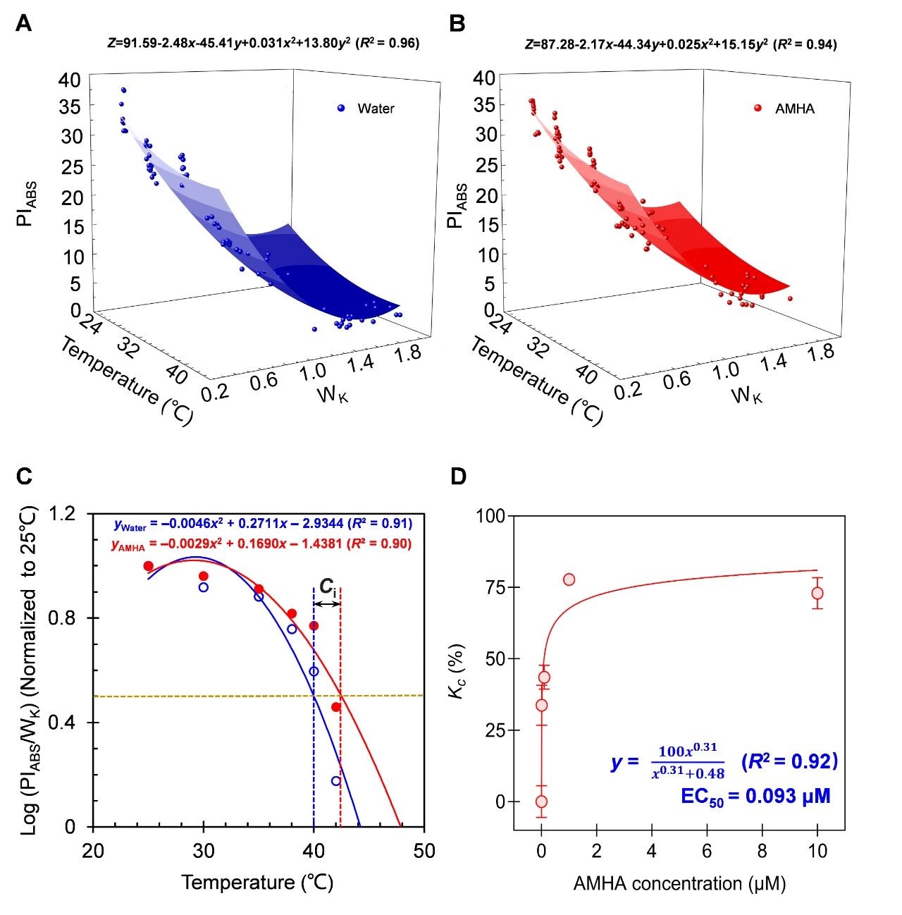 因此,作者*终选择PIABS和WK来建立一个模型,以确定拟南芥叶片经AMHA或水处理后的热敏感性。在对照(图3A)或1μM AMHA(图3B)的情况下,PIABS和WK与处理温度(25至42℃)之间的关系以三维图的形式表示,显示出非常高的相关性。与对照叶片相比,高温下AMHA处理的叶片中WK振幅的增加幅度较小,PIABS的下降速度较慢(图3A、3B)??悸堑絎K与温度呈正相关,与PIABS相反,基于PIABS和WK(1/WK)的倒数,开发了一种新的超敏参数,以更好地量化PIABS和WK对温度的联合变化。这一合成参数PIABS/WK被定义为植物高温敏感性(Hs)的指标。根据归一化为25℃的PIABS/WK(Hs)对数值与高温之间的关系,建立了拟南芥叶片中AMHA诱导抗高温能力(Ci)的评估模型(图3C)。Ci值是根据log(Hs)归一化值50%抑制的温度(命名为I50)计算得出的:Ci=I50(AMHA)-I50(水)。I50值是通过log(Hs)与水和AMHA处理过的叶片中的升高温度之间的回归方程确定的。AMHA的Ci值为Ci=42.51-40.02(℃)=2.49℃。与对照相比,AMHA抑制了高温条件下log(Hs)的降低程度,尤其是在温度超过38℃时(图3C)。为了精确评估AMHA诱导耐高温的能力,根据计算出的Ci的温度范围将耐热性分为以下三组:低水平(0℃