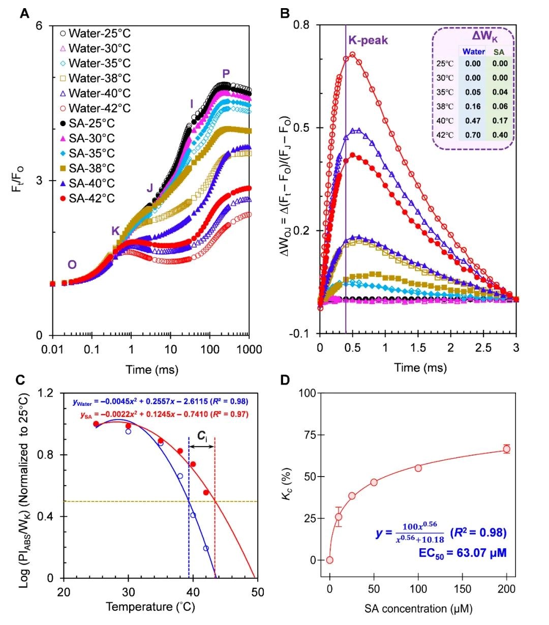 在本文的研究中,SA缓解了拟南芥叶片在40℃HT下OJIP曲线中K-P阶段的下降和K峰的出现,并对K峰水平表现出剂量依赖性(最高达200μM)的负面影响。不同浓度的SA明显减少了HT对PSII的OEC中心的损伤。在100μM SA的作用下,拟南芥叶片的OJIP曲线K-P阶段随温度升高而下降的趋势明显缓解,尤其是在38℃及更高的HT条件下。与对照叶片相比,SA处理叶片的K峰水平分别下降了约20%(35℃时)、63%(38℃时)、64%(40℃时)和43%(42℃时)(图4B)。这些结果与AMHA处理的叶片相似,但100μM SA?;EC免受HT损伤的能力高于1μM AMHA(图2B)。在不同温度下,SA和AMHA对11个JIP-test参数的影响相似(表1)。与1μM AMHA相比,100μM SA的HT抗性诱导能力更强,因为SA的Ci值比AMHA高1.6℃。在0至200μM的范围内,Kc与SA的浓度呈明显的正相关(图4D)。SA的EC50为63μM,远大于AMHA的EC50,表明在HT胁迫下,AMHA的植物诱导能力强于SA。因此,此模型可以用来区分SA和其他PRIs诱导HT抗性能力。