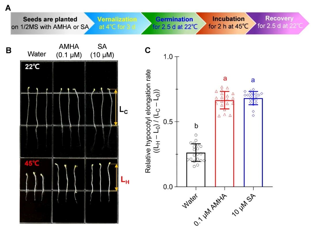 图7.AMHA和SA对高温条件下拟南芥幼苗下胚轴伸长的影响