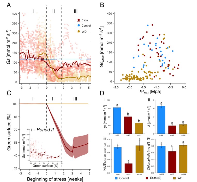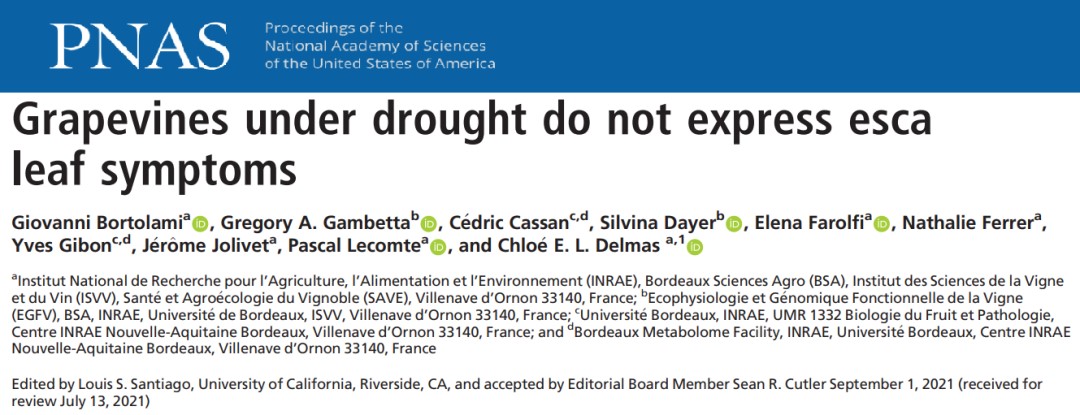 近期法国国家农业食品与环境研究院(INRAE)Chloé E.L. Delmas团队在国际权威学术期刊PNAS发表了题为“Grapevinesunder drought do not express esca leaf symptoms”的研究论文。该研究通过比较两年内干旱和正常条件下葡萄感染依科病的比例,利用美国PP SYSTEMS公司制造的TARGAS-1便携式光合作用测定系统测定叶片气体交换参数等相关生理指标,发现干旱并未起到促进作用,反而抑制了依科病的感染,并揭示了干旱和依科病影响葡萄生长的不同机理。