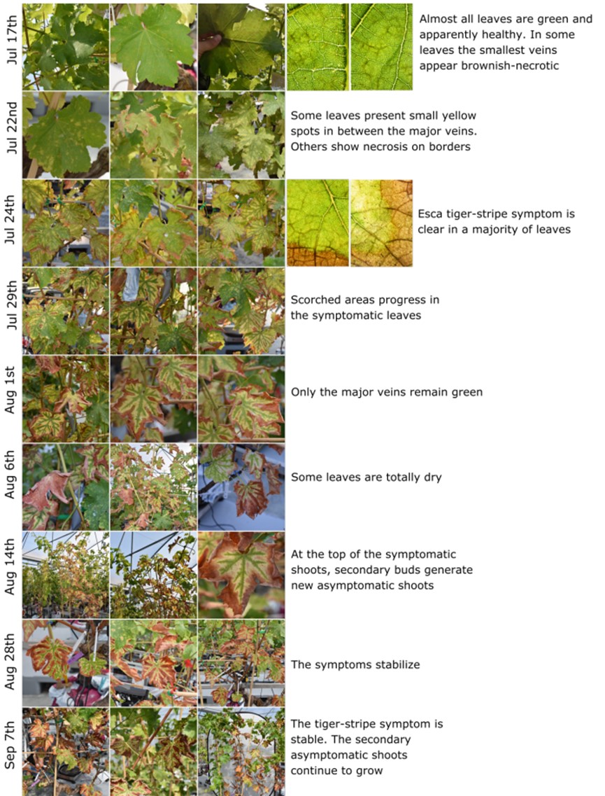 因此,有观点认为干旱和依科病之间具有强大协同作用,而这种作用可能会加速植物死亡。由于葡萄并不能依靠人为的病原菌接种来感染依科病,而自然条件下被感染的植物又缺乏环境数据的记录,因此这一观点是否成立仍有待进一步进行研究证明。