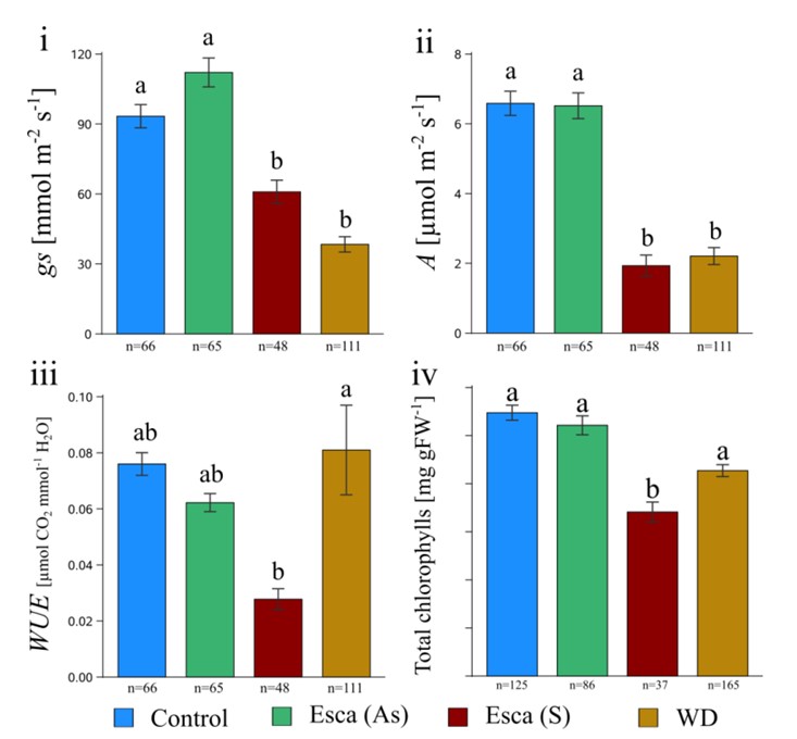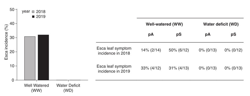 为了可以在实验室条件下研究干旱和依科病之间的相互作用,该研究将田间自然条件下生长的葡萄树(30年树龄)移至可控的实验环境中,并按其有无依科病感染史分为无症状植物(pA)和有症状植物(pS)。将这些植物随机分成两组,并对其中一组进行缺水处理。经过连续两年的实验发现,正常生条件下,约有33%的植物出现了依科病症状;而缺水条件下生长的植物都没有出现依科病症状,这表明干旱对葡萄树感染依科病并没有促进作用,只有抑制作用(图2)。