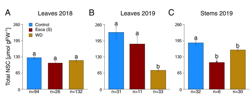 病原体感染和干旱通过影响植物光合作用和植株生长,从而影响碳平衡(碳水化合物的合成和消耗)。通过对叶片中非结构性碳水化合物(NSC)的测量,发现干旱和依科病对植物的总NSC都没有影响。但2019年试验结果显示,干旱和依科病处理对植株各部位NSC分布存在显著差异,依科病处理下NSC在叶片的分布多于茎;而干旱正好相反(图6)。
