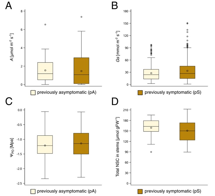 另外,依科病对光合作用的影响更大(图3D),而在叶片水平上,观察到在整个生长季中,对照和依科病植株上无症状健康绿色叶片之间的气体交换参数(gs、A和WUE)和叶绿素含量差异不显著(图4)。图5表示在2018年和2019年干旱处理中,在2012年至2017年间未感染(pA,浅黄色)或感染(pS,深黄色)依科病的材料,在净光合速率(A)、植物叶片气孔导度(B)、水势(C)、总NSC(D)上,pA与pS差异并不显著。