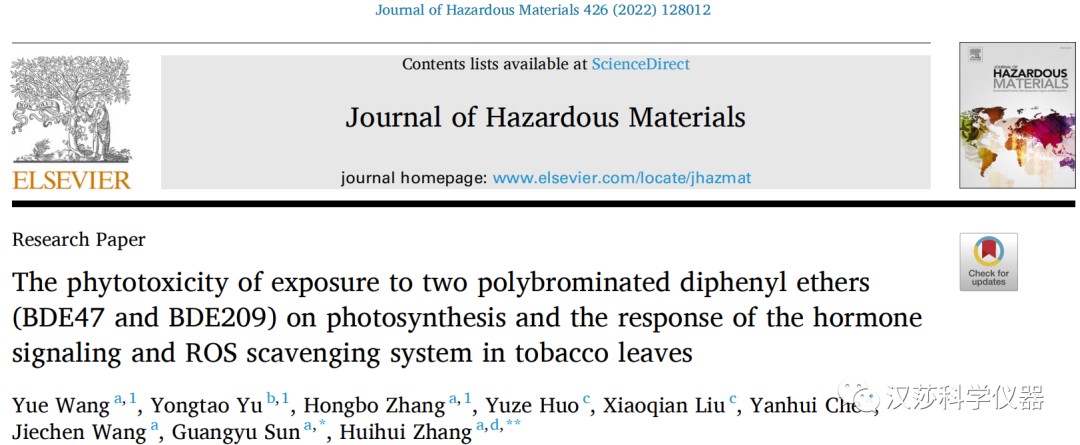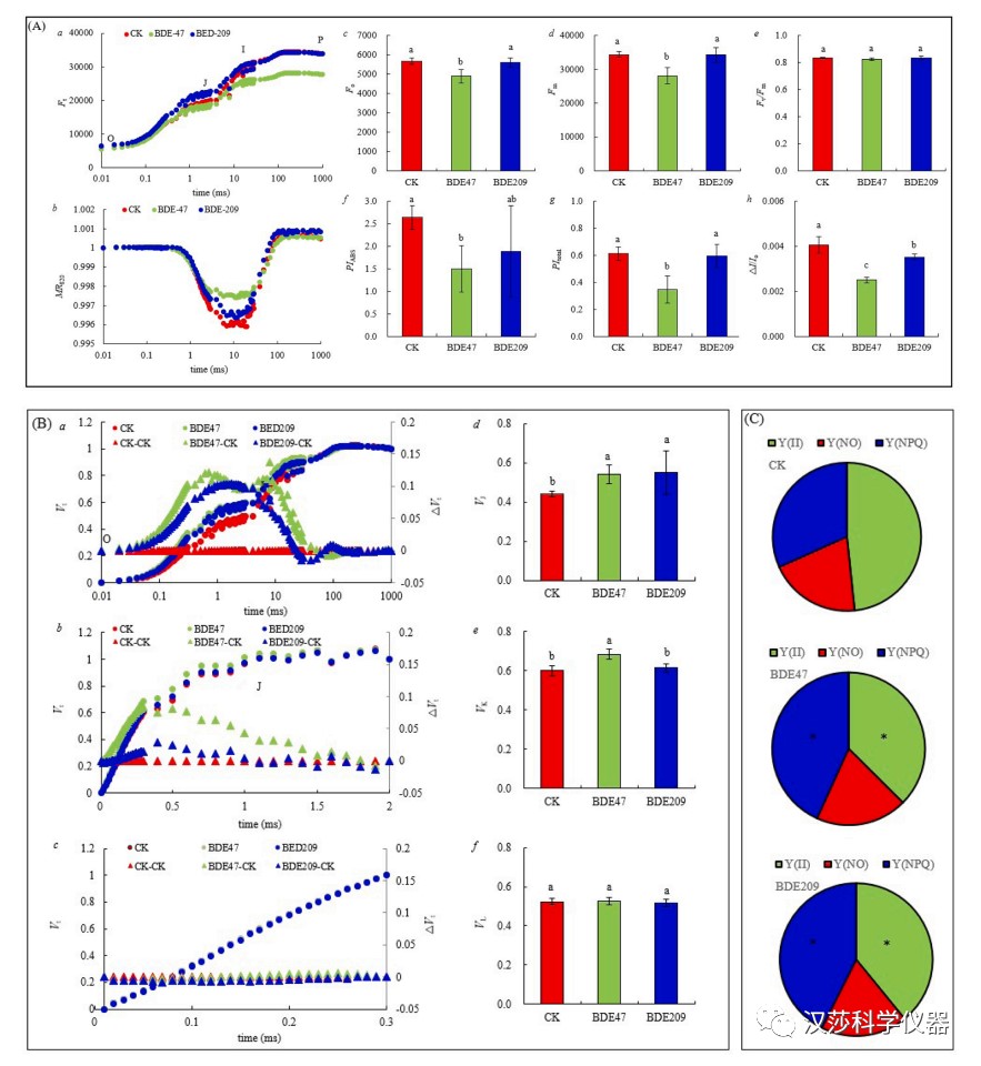 该研究中使用英国Hansatech公司生产的M-PEA-2多功能植物效率分析仪和FMS-2叶绿素荧光仪测定了不同处理的快速叶绿素荧光诱导动力学曲线(OJIP曲线)和叶绿素荧光参数。研究结果“The phytotoxicity of exposure to two polybrominated diphenyl ethers (BDE47 and BDE209) on photosynthesis and the response of the hormone signaling and ROS scavenging system in tobacco leaves”发表在Journal of Hazardous Materials(IF=10.5886)杂志上。