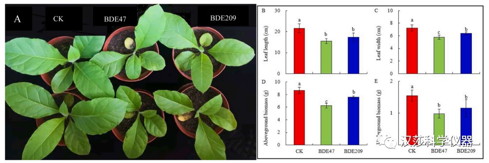 图1 BDE47和BDE209处理下烟草植株表型(A)、叶长(B)、叶宽(C)、地上生物量(D)、地下生物量(E)