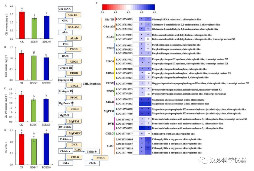 烟草在经过处理之后叶片变黄的主要原因是叶绿素含量的下降。BDE47和BDE209均导致Chl a+b显著下降,但两者作用不同。烟草叶片中的Chl a对BDE47更敏感,而BDE209主要抑制Chl b的合成。结合转录组分析发现,BDE47处理之后,28个叶绿素合成相关的基因表达显著下调,BDE209则造成24个基因表达下调。其中,BDE209抑制了Chl b合成途径关键酶叶绿素a加氧酶(CAO)基因的表达,进而抑制Chl b的合成。