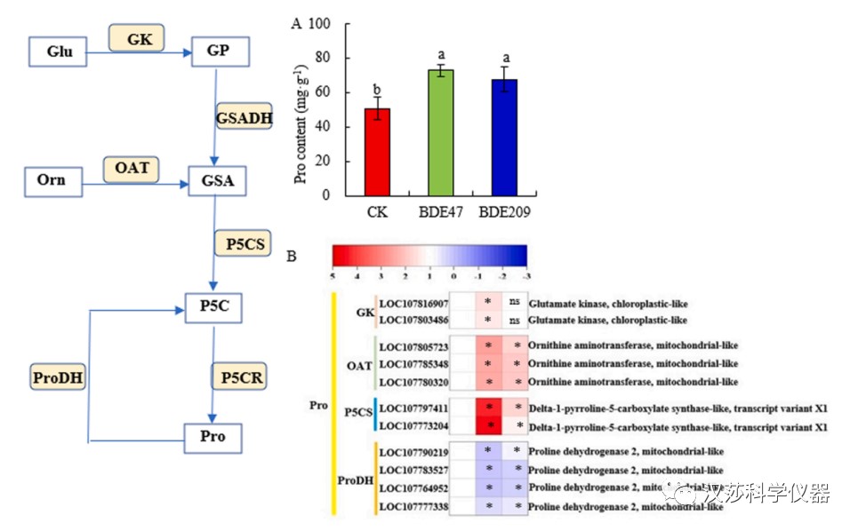 在逆境条件下,植物体内会累积大量脯氨酸(Pro),不仅维持渗透平衡,还可清除ROS。本研究中,烟草经BDE47和BDE209处理后,叶片中Pro的含量均显著增加。结合转录组分析发现,烟草暴露于BDE47和BDE209后,与Pro合成途径相关的基因表达上调,与Pro降解途径相关的基因表达下调,叶片中Pro含量显著增加,以应对PBDEs的胁迫。