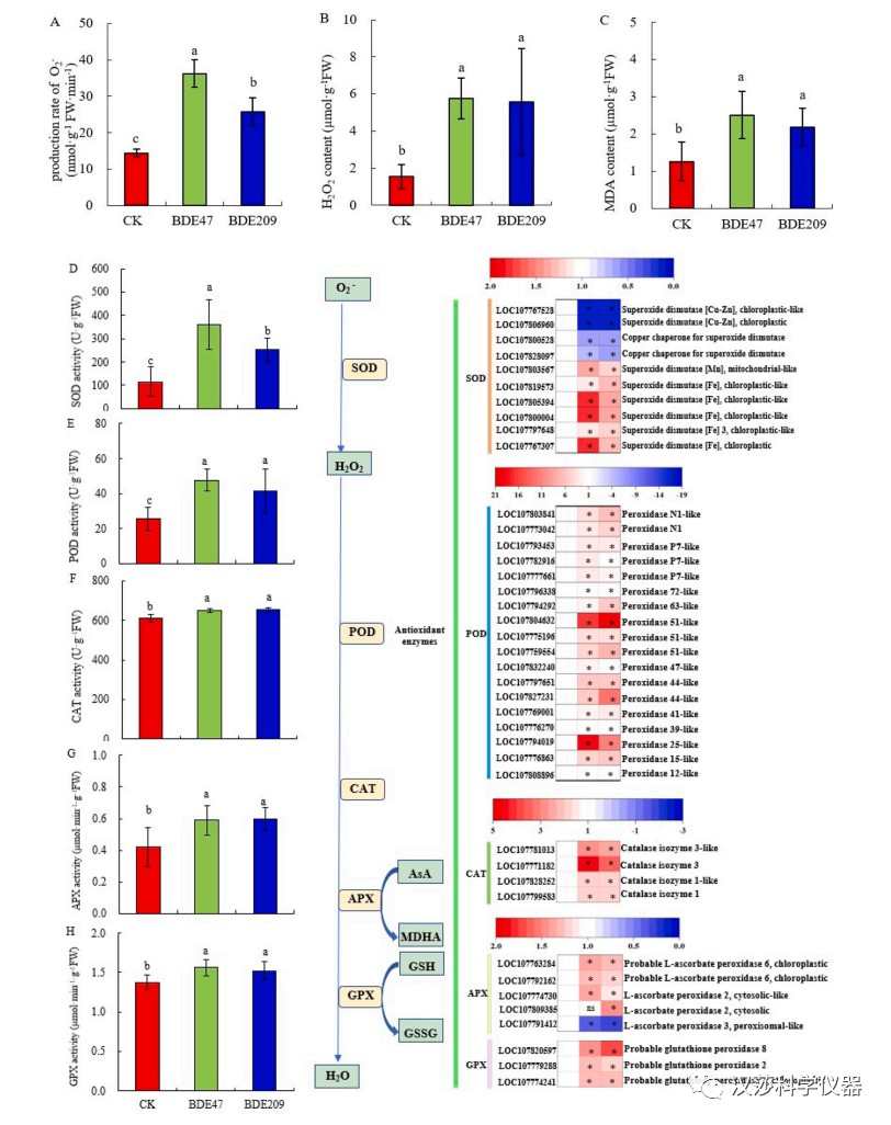 烟草经BDE47和BDE209处理后,叶片中的ROS显著增加。抗氧化酶活性的提高和相关基因表达的上调有助于清除过量的ROS,防止BDE47和BDE209处理可能引起的过度氧化损伤。