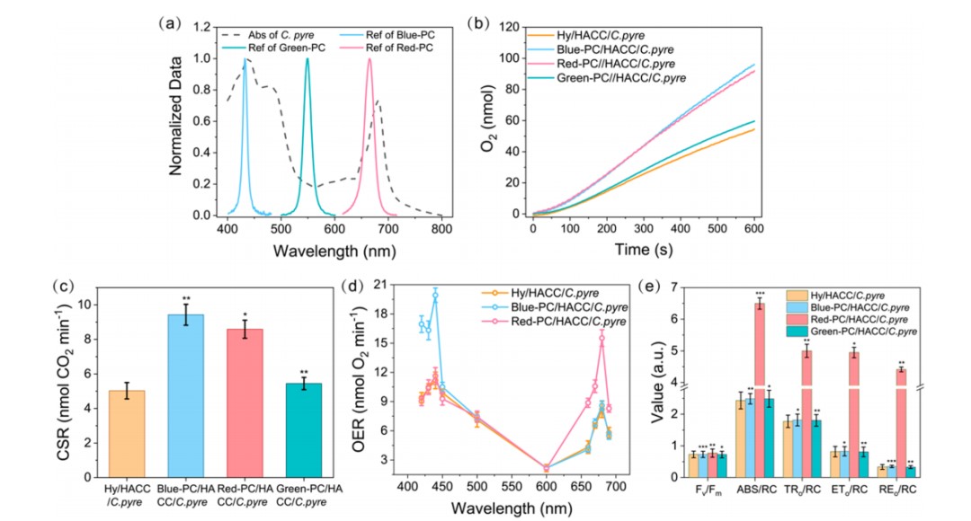 通过比较这三种不同波长(蓝光、红光和绿光)PC水凝胶对C.pyre光合作用的影响,可以更清楚地了解慢光子效应的作用和机制。作者使用英国Hansatech公司的Chlorolab2+(液相氧电极测定系统)和美国PP Systems公司的CIRAS-3(便携式光合作用测定系统)分别测定氧气释放速率(OER)和碳固定速率(CSR),结果表明,Blue-PC/HACC/C. pyre and Red-PC/HACC/C. pyre的光合效率的显著提高(图3a,b,c,表1和 图4)。