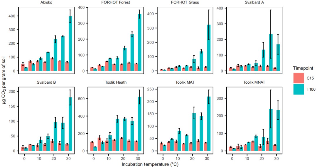 图1 在0-30°C之间培养的8个北极和亚北极地点土壤样本中测量的平均累积呼吸(μg CO2 g?1 soil)。T100:100天孵化后的累积呼吸;C15:在选定的时间点确定的累积呼吸,使呼吸量大致等于在30°C下孵化的样品15天后的累积呼吸量