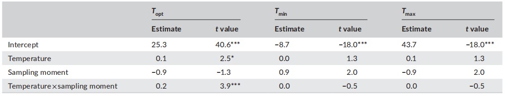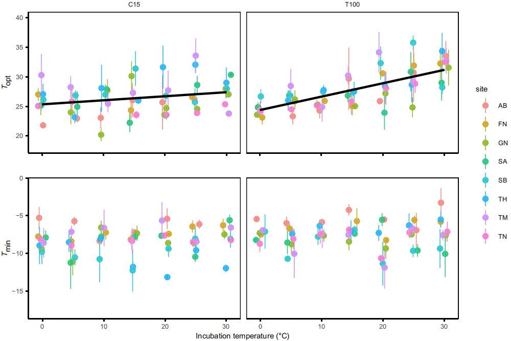 细菌群落的温度-生长关系受到孵化温度的影响。Topt(最佳生长温度)随着孵化温度的升高呈线性增加趋势(图2)。与C15样品相比,T100样品的Topt增长明显更快,孵化温度每升高1°C分别增加0.27°C±0.039(SE)和0.07±0.028°C。在T100中,生长温度范围(Tmax?Tmin)每°C的孵化温度增加了0.14°C,但在C15中,生长温度范围在整个孵化梯度上没有显著差异。然而,从0到30°C,T100温度下的微生物生长率显著下降了36.2%。总体而言,温度和采样力矩都会影响Topt和Tmax,而Tmin没有显著变化,导致了更广泛的温度生长范围(表2)。