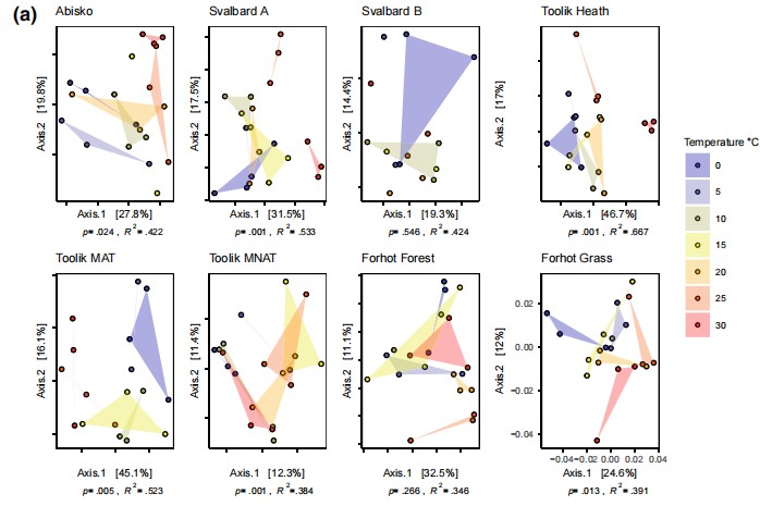 为了探究当北极土壤暴露在实验性气候变暖环境中时,土壤细菌群落是否会发生温度适应,荷兰阿姆斯特丹生命与环境研究所James T. Weedon团队对来自从亚北极到高北极的4个不同研究地点的8种土壤进行了孵化实验,探究孵化温度对北极土壤细菌群落的温度-生长关系和群落组成的影响。研究结果“Optimal growth temperature of Arctic soil bacterial communities increases under experimental warming”发表在Global Change Biology(IF=13.211)杂志上。