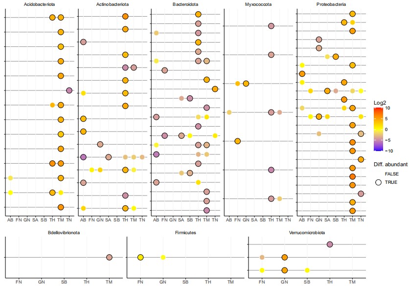 图4 细菌扩增子序列变体(ASVs)的差异丰度分析,以每摄氏度孵化温度的对数倍差显示(点的颜色)。