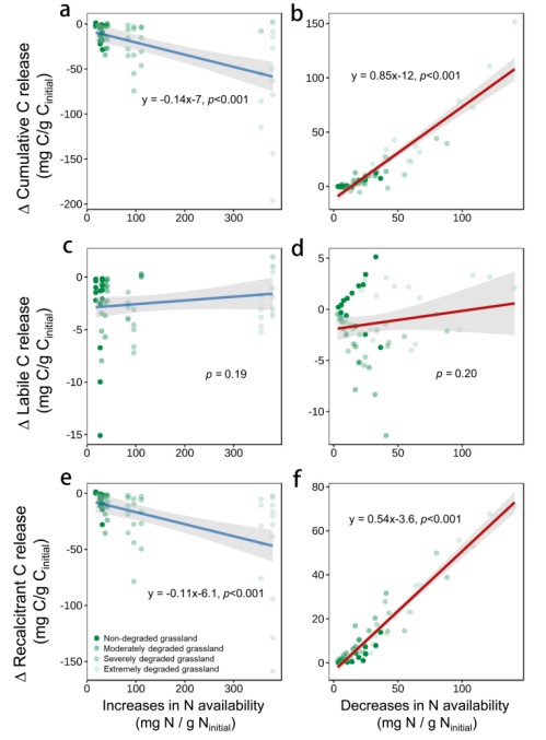 2 累积碳释放(a,b)、易分解有机碳释放(c,d)和难分解有机碳释放(e,f)对氮可用性的增加和减少的敏感性。在每个草地上有15个重复(3个重复样方×5次测量)。灰色区域表示回归的95%置信区间。本研究结果为氮对SOC分解的不同影响和机制提供了直接证据,应在土壤过程模型中加以考虑,以更好地预测营养循环对全球变化的响应。