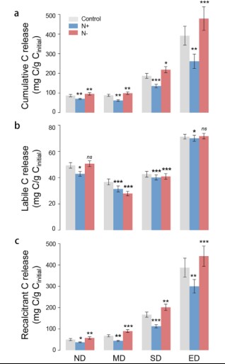 (N)可利用性在土壤有机碳(SOC)的固持和生物地球化学循环中发挥着至关重要的作用。通常,氮可利用性对土壤有机碳分解的影响是在氮富集(N+)实验的基础上探讨的。然而,许多自然和人为过程往往会降低土壤氮可利用性。氮可利用性的降低将导致土壤中的氮缺乏或营养失衡,土壤有机质消耗,土壤多功能性受限,并向大气中释放更多的碳从而加剧气候变暖。因此,探索土壤氮可利用性降低的影响对于全面了解SOC过程以应对未来气候变化中复杂的资源供应是必要的。目前还没有直接证据表明氮可利用性(N?)的降低如何影响SOC分解,微生物驱动的SOC分解对氮可利用性的反应机制尚不清楚。