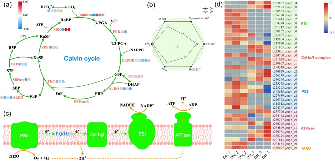 由上述可得,在LN、DN和DH处理下,受强光损伤的PSII可恢复。与LN和DN相比,DH几乎完全抑制了PSII活性的恢复(图1a)。在最初5h内,LN处理下PSII恢复速度略快于DN,但无显著性差异。5小时后,LN的PSII恢复速率显著快于DN(图1a)。LN处理下海草的PSII活性最终恢复到与高光处理前相同的水平,但DN的PSII活性仅恢复到处理前活性的80%(图2a)。研究人员模拟在水下5cm进行打光照射,在光照1小时后,DH处理下海菖蒲PSII的光化学效率和氧释放速率都显著低于在LN或DN,在DN处理下其PSII的光化学效率略低于在LN(图1b,c)。除了先前观察到的光合参数(Fv/Fm、O2释放速率和ΦPSII)外,与DN处理相比,DH处理的RC/CSM和WK降低,而1?Vj没有变化(图2b),这表明DH导致PSII反应中心失活和OEC损伤,而没有加重PSII的D1蛋白损伤。为了进一步探讨低氧对黑暗条件下海草光合作用的影响,采用转录组学比较的方法分析了低氧胁迫下DN和DH处理下海草光合作用相关基因的差异表达。与DN相比,在DH中鉴定了33个参与卡尔文循环的酶基因,其中19个是下调基因。且DH中鉴定了涉及光反应的四种主要复合物的三十六种基因,其中15种基因是下调基因(图2c、d)。在光反应的四个复合体中,PSII复合体中下调基因的比率最高,为58%(图2d)。