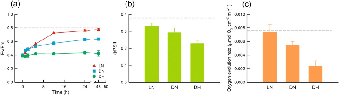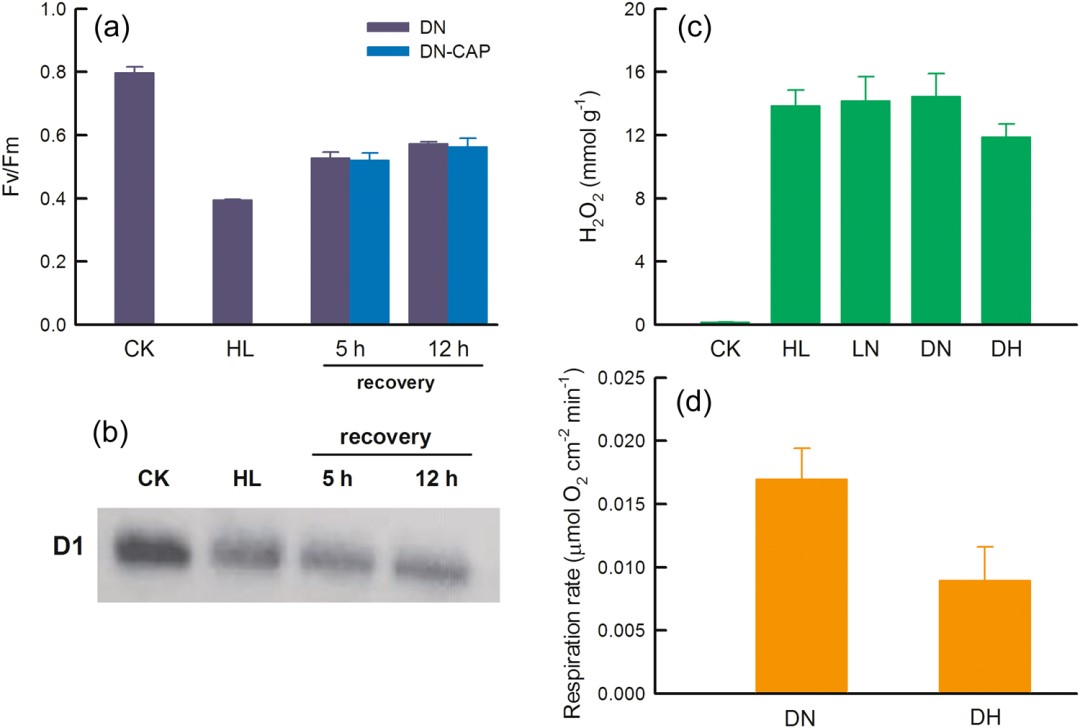 图3 不同环境下D1蛋白、H2O2和呼吸速率的变化当D1蛋白质周转被CAP抑制时,在DN下PSII活性的恢复没有延迟(图3a)。D1蛋白在强光处理1小时后显著降解,并且在DN下PSII活性恢复期间其未重新合成(图3b)。这些结果表明,PSII活性的恢复不涉及DN下D1蛋白的再合成。在强光处理1小时后,H2O2含量显著增加。在恢复5小时后,处理的H2O2含量没有变化,除了DH处理略微降低(图3c)。与DH处理的呼吸速率相比,DN的呼吸速率下降了近50%(图3d)。