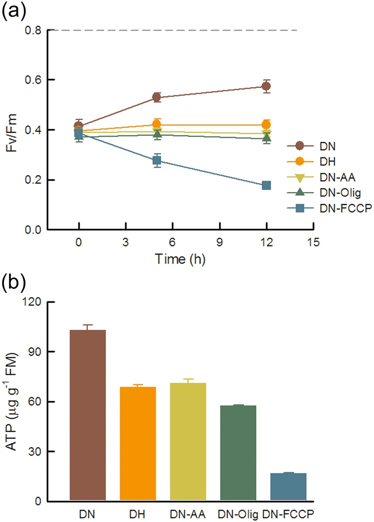 图4 抑制呼吸道ATP产生对光系统II(PSII)恢复的影响在考克斯途径和ATP酶分别被AA和Olig抑制后,即使在常氧下PSII活性也不能恢复(图4a)。与DN相比,DH、DN-AA及DN-Olig 的ATP含量均显著降低(图4b)。在氧化磷酸化被解偶联剂FCCP消除后,PSII活性不能恢复,DN-FCCP比其他处理降低程度更显著(图4a),且DN-FCCP处理的ATP含量也低于DH和DN其他处理的ATP含量(图4b)。