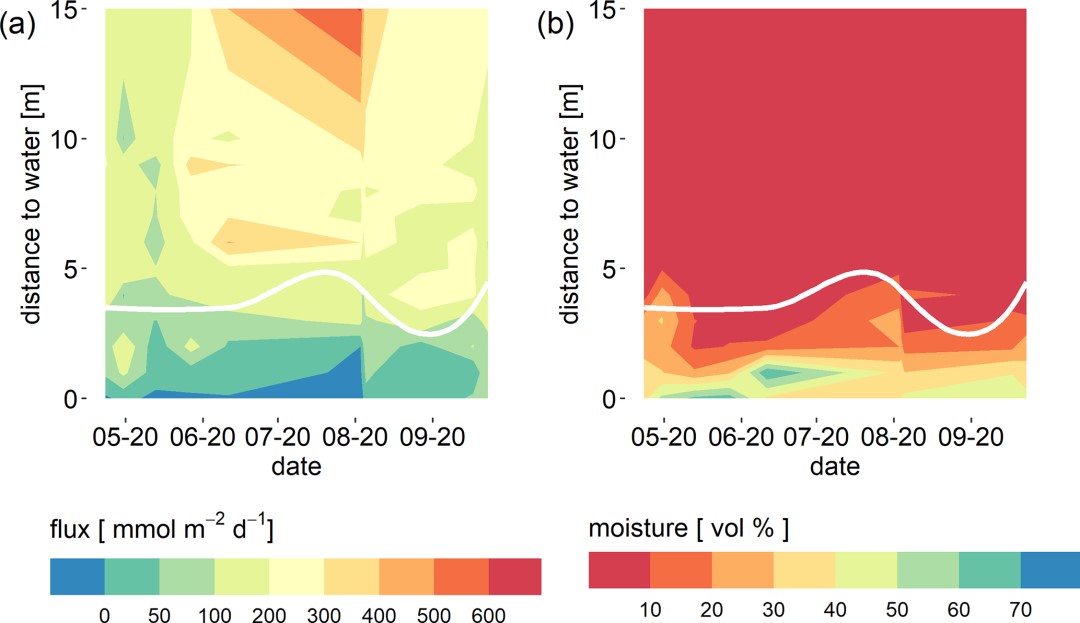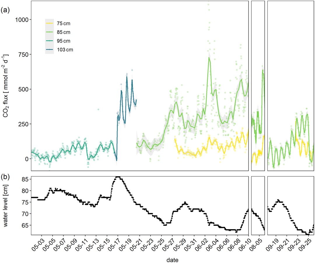 该河流表现出典型的夏季流量情况。水位大多在1m以下,因六月底出现了一次高流量,仅在初夏的6周、8月第一周和9月的短时间内出现了大量的干涸沉积物,在这些时期使用CFLUX-1全自动土壤碳通量测定系统进行CO2通量长期自动测量。CFLUX-1的位置会随水位的变化而变化,其中5月17日,由于水位变化,CFLUX-1被移至更高处(离水位零点103cm),5月20日后水位下降,CFLUX-1被移至新出现的沉积物处。研究发现,CO2通量显示较高的波动。整个测量阶段,通量在-120~1135mmol/m2/d之间波动,平均值为149±155mmol/m2/d。在更靠近水面处测量的CO2通量比高坡度处测量的更低,变化也更小。6月份之后尤其9月份的日波动增大。