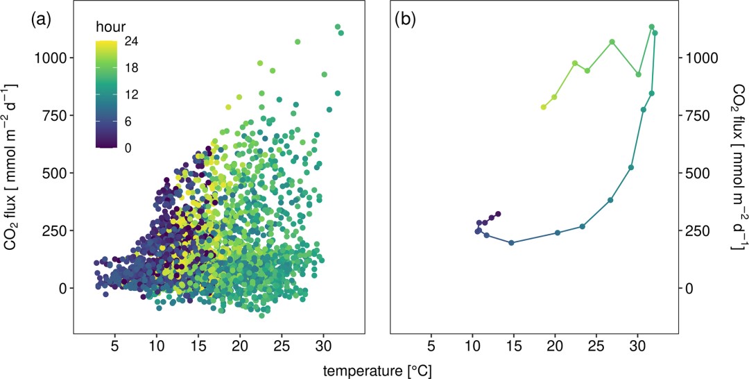 观察到的CO2通量较高的日波动表明其受温度调节。如果将所有CO2通量数据和温度一起作图,CO2通量的温度响应不是很清晰(图3a),但如果绘制一天的数据,则出现了一个明确的响应模式(图3b):CO2通量的温度响应受时间的影响,产生典型的滞后曲线——白天气温上升导致CO2通量的指数级增加,下午气温冷却,通量仍较高,其温度响应明显延迟了。