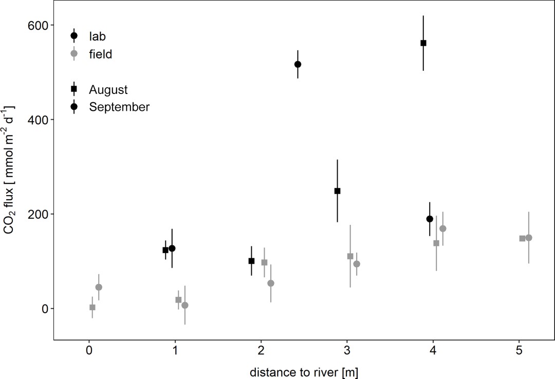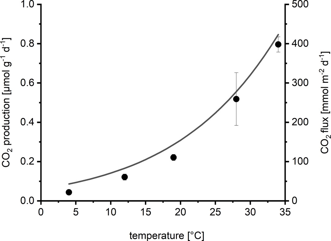 为了评估地下水脱气,作者进行了222Rn测量。结果表明,沉积物CO2通量不是来源于地下水。为了检验观察到的CO2通量是否可用沉积物中的微生物呼吸来解释,进行了实验室培养。结果发现,实验室孵育测定的沉积物呼吸速率在8月份为0.9±0.45μmol/g/d,9月份为0.64μmol/g/d,且呼吸速率随与河流的距离增加而增大。根据这些速率计算出的潜在CO2通量与原位测量的CO2通量相似或更高(图6)。实验室培养也进行了温度验证,结果也与原位测量的温度响应相似(图7)。因此,沉积物呼吸足以解释观测到的CO2排放。