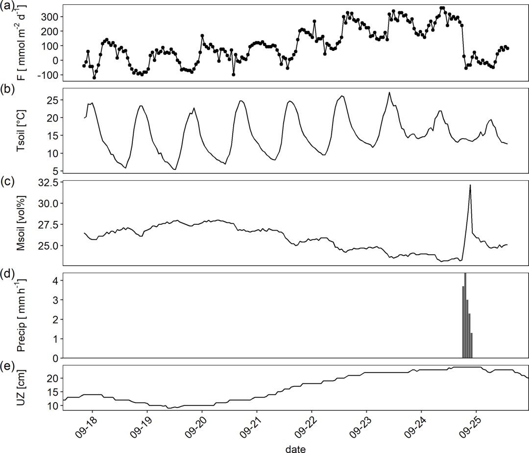 以9月份的某一周数据为例,可观察到温度、非饱和带厚度和降水是如何调节CO2通量的(图4)。温度驱动着CO2通量非常明显的日波动,但通量的绝对水平随着非饱和带厚度的增加而增大。9月25日的降水事件导致沉积物湿度突然增加,但CO2通量明显下降。
